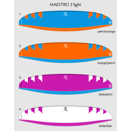 Le MAESTRO 3 présente un allongement légèrement plus important, un profil différent, des joncs différents (Nitinol avec rembourrage), un gréement légèrement différent, des sangles, une tension de voile et des mini-nervures différentes, etc.